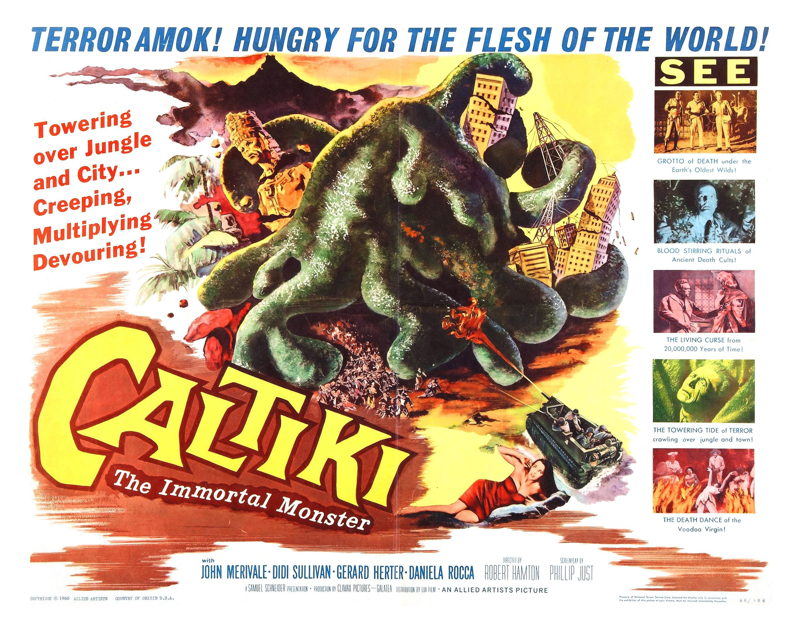 Next up was sitting in and watching an Italian “classic” Caltiki, The Immortal Monster. It’s films like these that are so much fun to watch with a crowd. It’s a Blob wanna be. The blob in question looks like my old bath robe rolled up and soaked in oil. The dubbing is hilarious. We get tonka toy tanks that are right out of a Toho film and cursed Mayan ruins thrown in for good measure. No doubt it’s a guilty pleasure.