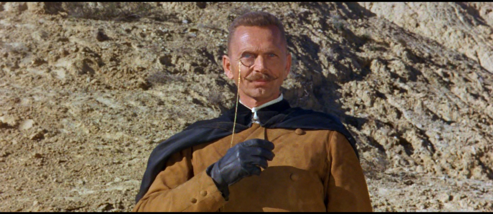 It isn’t long before Van Cleef starts to look closer at the man who hired him and his cast of hired guns including a German Baron and a shady son-in-law. From the outset of the film we know that Van Cleef is going to have to go one on one with the Baron. He’s a sharpshooter from overseas who has been hinting to Van Cleef from their first encounter that he loves a challenge. His monocle, cape and leather gloves are nicely featured as Van Cleef awaits the inevitable showdown.