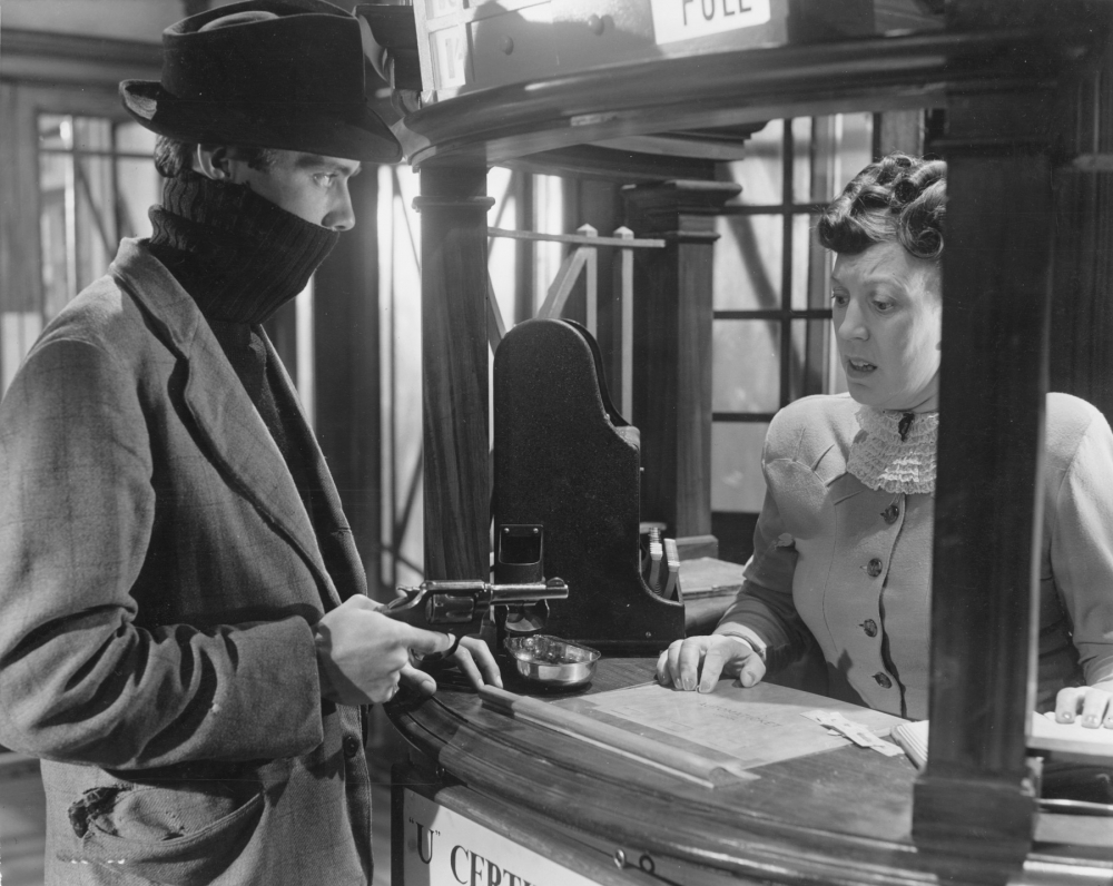 There’s a parallel story going on here with a young runaway played by Peggy Evans who is caught up in a relationship with a small time hood played by Dirk Bogarde. Dirk’s a loose cannon and out to make a fast buck. It’s a home invasion where he runs off with the keys to a jewelery store that sets the course of the film’s direction.