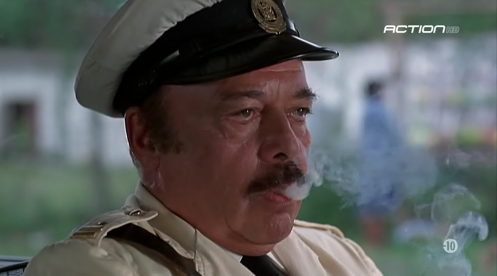As the sole survivor of the ill fated hiking expedition, Dudikoff finds himself in demand. Channeling the spirit of Claude Rains in Casablanca we have local police chief Herbert Lom wanting information.