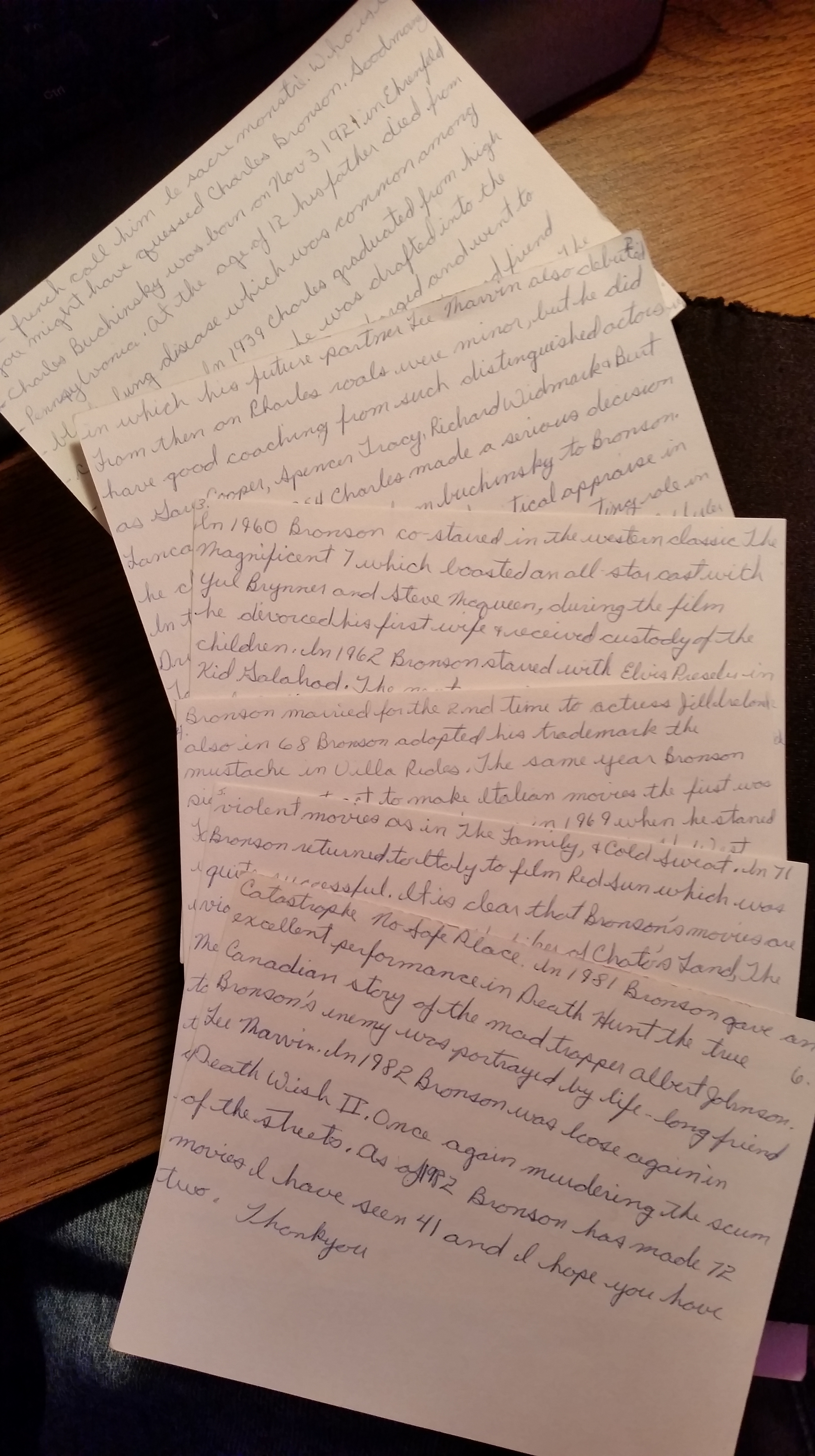 I even found a couple of homework projects where I featured the tough guy. If anything this proved I was a budding know it all even as a kid growing up. Here’s the grade 6 cue cards for my speech in English class on Bronson where I was basically urging my fellow students to check out his films.