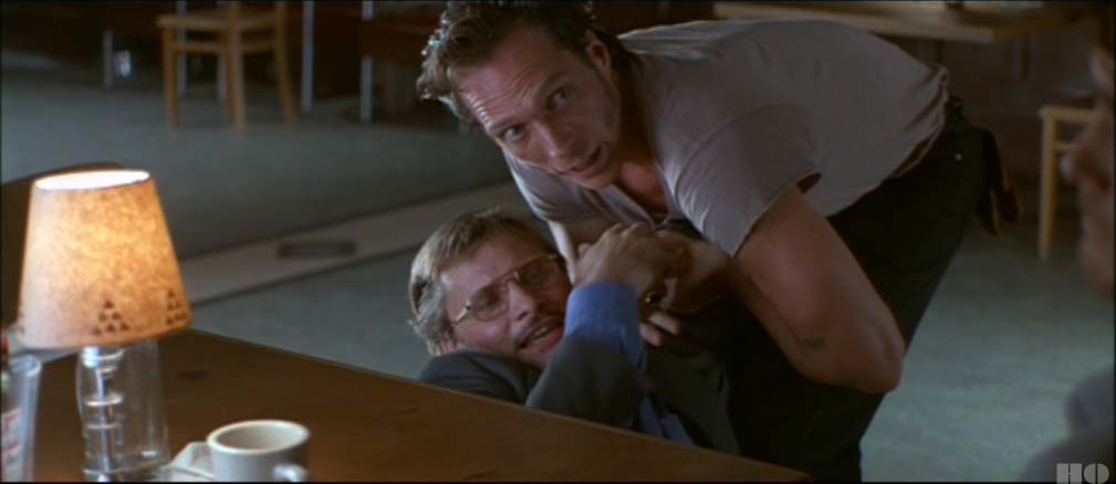 Our threesome ditch their car and head into all all night gin joint and quickly find themselves thrust into a hostage taking scene when the police show up outside led by Joe Mategna. What Dillon and company don’t yet realize is that the police aren’t here for them. They believe the man from their stakeout is the one holding the gun and the hostages in terror.