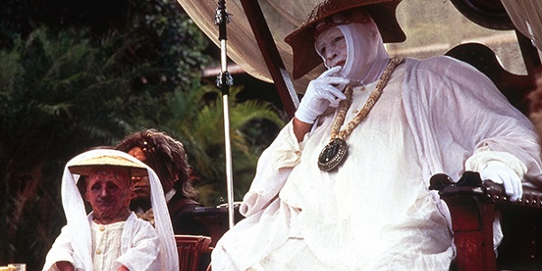 Marlon seems to be channeling the spirit of Charles Laughton in another embarrassing “take the money and run” performance which he seemed to do repeatedly towards the end of his film career. In the space of 8 minutes he’s had more freaky looking costume changes than Marlene Dietrich in a 1930’s extravaganza. With the long journey of the first half hour coming to an end and the build up of Brando’s character it’s an easy comparison to his appearance in Apocalypse Now as Kurtz.