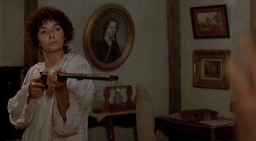 Jack starts the film on the run. A posse is in hot pursuit on horseback led by Christopher Lloyd and John Belushi. The Rio Grande river into Mexico isn’t about to save him from a typically loony looking Lloyd. Brought back to justice for horse thieving Jack is sentenced to hang. The only thing that can save him now is if a woman is willing to marry him. There’s been a shortage of men available for wedlock since the civil war death toll. Against the advice of sheriff Richard Bradford, Miss Steenburgen takes Jack in.