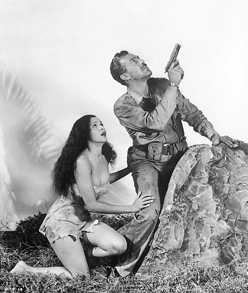 Fortunately the gang are not hurt in the crash landing. Shortly thereafter they find the one time horror queen Acquanetta in a deserted jungle village telling them that a fireball from the sky landed in the forbidden mountains of her people. Thank you Miss Acquanetta for your brief appearance.