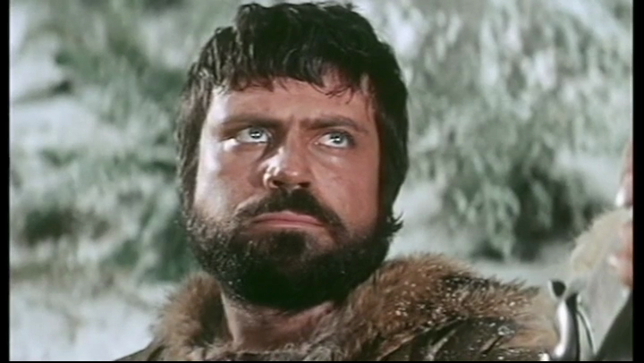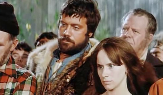 Big, burly, bearded and covered in furs is the forceful screen presence of Oliver Reed making his way down river in a canoe. At times it’s conveniently filmed in close up with water thrown about while the projection screen behind him rolls film of some serious rapids, Ollie’s destination is a settlement where a steamship docks once a year.