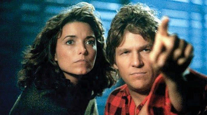 For those unfamiliar with this E.T. like story aimed at adults, Karen Allen stars as a recently widowed woman who longs for her husband. Not far off from her isolated farm, a space ship has crash landed, lighting the night skies up with a flaming brush fire. A light emanates from the scene and travels over an inland lake to her home. Almost probe like, the light takes focus on a home movie running on screen featuring Jeff Bridges. A lock of hair in a memory book provides the DNA needed for the entity to find itself a human form.