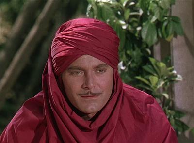 The whole tale will culminate with Hall attempting to stop the wedding of his beautiful Montez to evil Kurt Katch, the Mongol ruler. To do so he will have to count heavily on Devine and Montez’ personal servant, Turhan Bey. Billed above the title and in third position, Bey was at this time a familiar face at Universal appearing in various titles including The Mummy’s Tomb, The Mad Ghoul and an earlier Hall-Montez colorama, Arabian Nights.