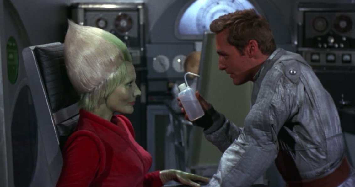 Low budget it may be but the small scale sets work fine. That is probably due to the effective use of lighting what we can actually see of the ship’s interiors. Plenty of greens and blues flooding the screen seem to add to the aura of Marly’s vampire woman in green.