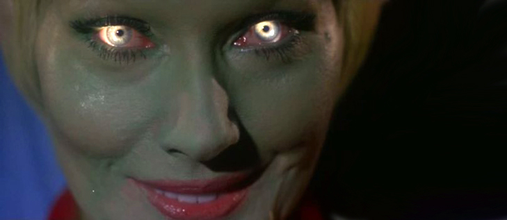 When Dennis Hopper is found drained of life and a green woman even Bill Shatner might do best to avoid sated with blood, they know that she intends to feed upon them. In typical science fiction clichéd dialogue we have Saxon disgustedly claiming, “She’s a monster.” He wants her killed. On the other hand we have our science officer proclaiming, “It’s fascinating!” He of course wants to protect the lady with the bloody appetite for future study. Sounds like some of those Alien films to me.