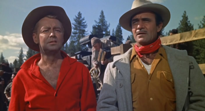 It’s a Jaguar production (Alan Ladd’s company) beginning with a train riding Ladd leading his group of happy singing loggers into the next territory. Their mission is to fell the trees atop a mountain above a small frontier town where they are not welcome. Ladd’s group of adventurers include Roland and Noah Beery Jr. As the train pulls into the station, it’s blatantly clear who the star of this film is. The entire cast of loggers are in drab colors while Ladd is wearing a vibrant technicolor red shirt.