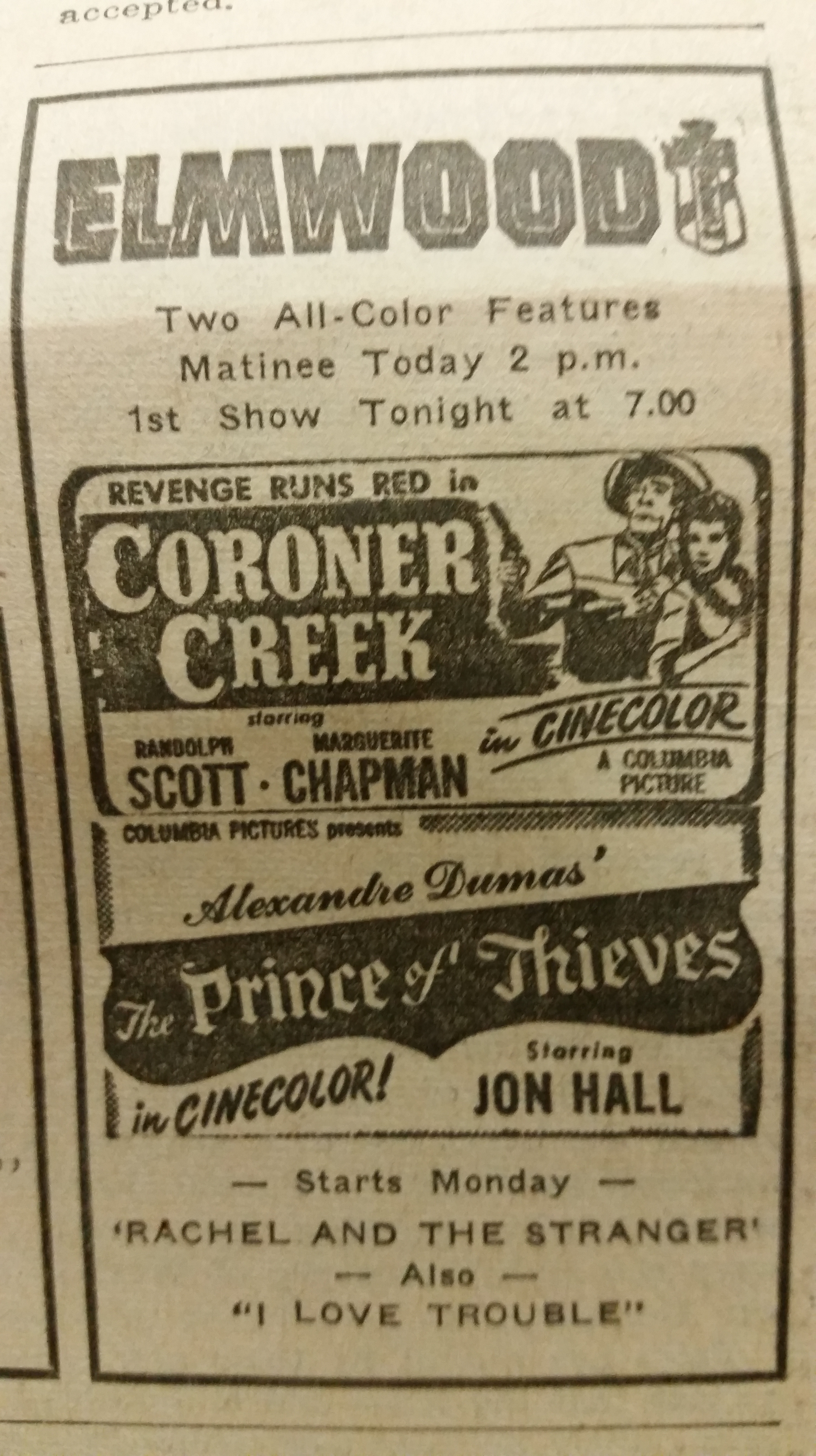 If Randolph is your favorite, than get over to the Elmwood today at 2 for the all color matinee. And please note that starting Monday is Rachel and The Stranger starring that trouble maker Robert Mitchum I’ve been hearing a lot about. I’m more than confident that his costar Loretta Young can straighten him out.
