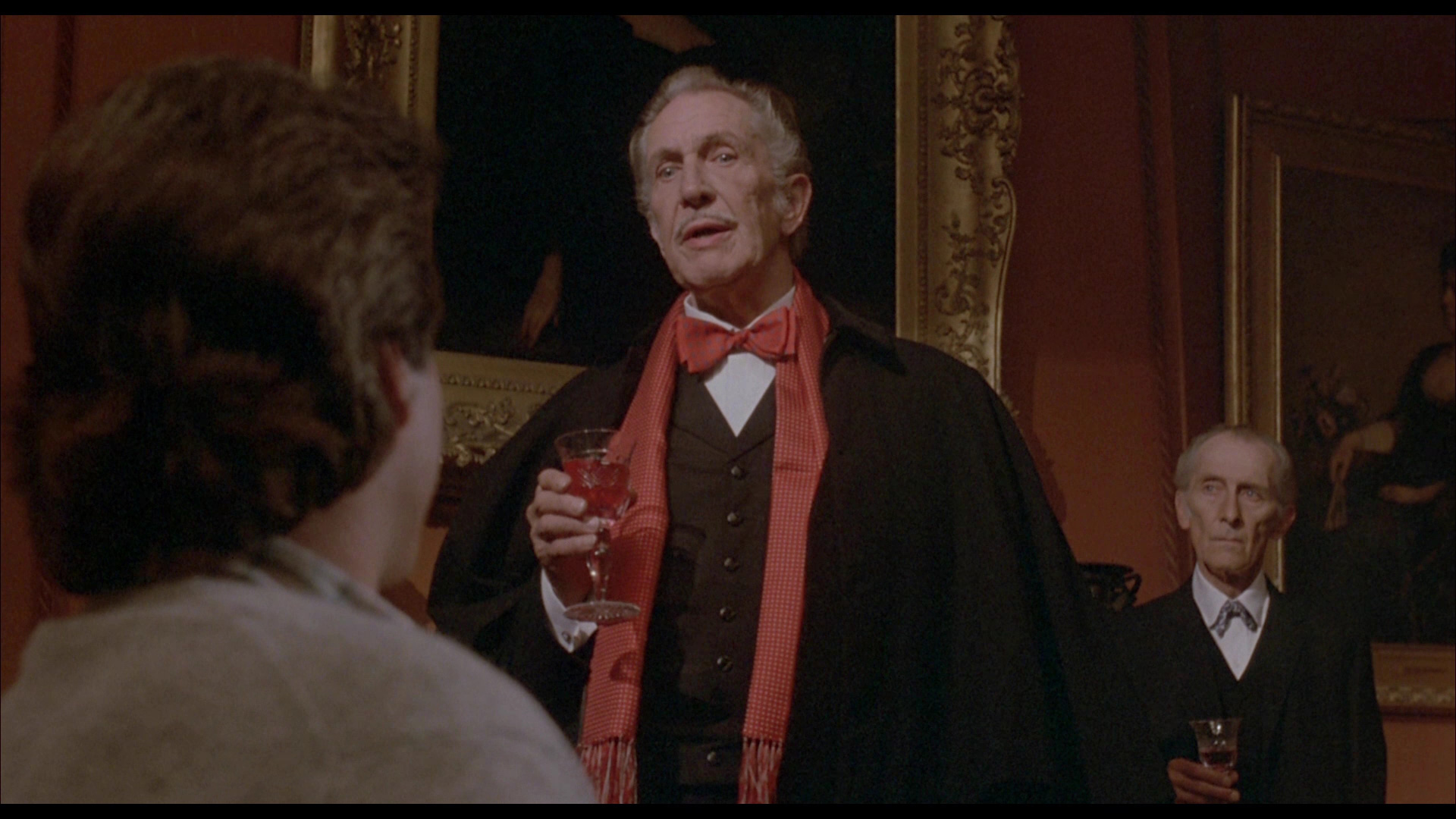Cushing and Lee are historically famous for their many duels and collaborations over the course of their careers, most notably in the many Hammer productions they teamed up for. I’d loved to have seen Dear Vincent join them in the fun but it wasn’t until 1969 that Lee appeared with Price in the Oblong Box in a rather minor role. The following year all three appeared in Scream and Scream Again. That made for great advertising but in truth, Cushing was in it for about 8 seconds and never appeared with the other two. A cameo by Peter in the second Price/Phibes film shouldn’t be counted but in Madhouse, Peter and Vincent finally costarred together though the film comes off as a minor entry in Price’s horror cycle. So with this Cannon film, the trio finally share billing and enough scenes to satisfy their fans. Click here for my views on the importance of actors appearing together even if the film’s turn out to be less than hoped for.