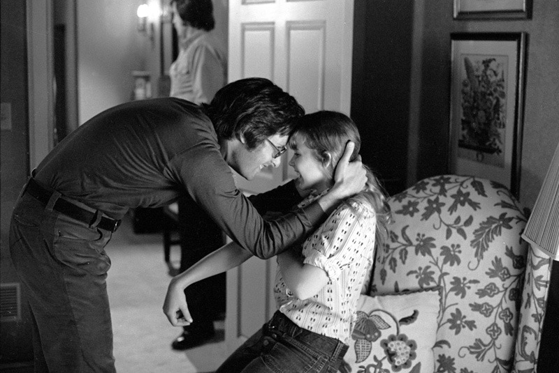 Medium BTS shot of director William Friedkin and Linda Blair as Regan MacNeil.