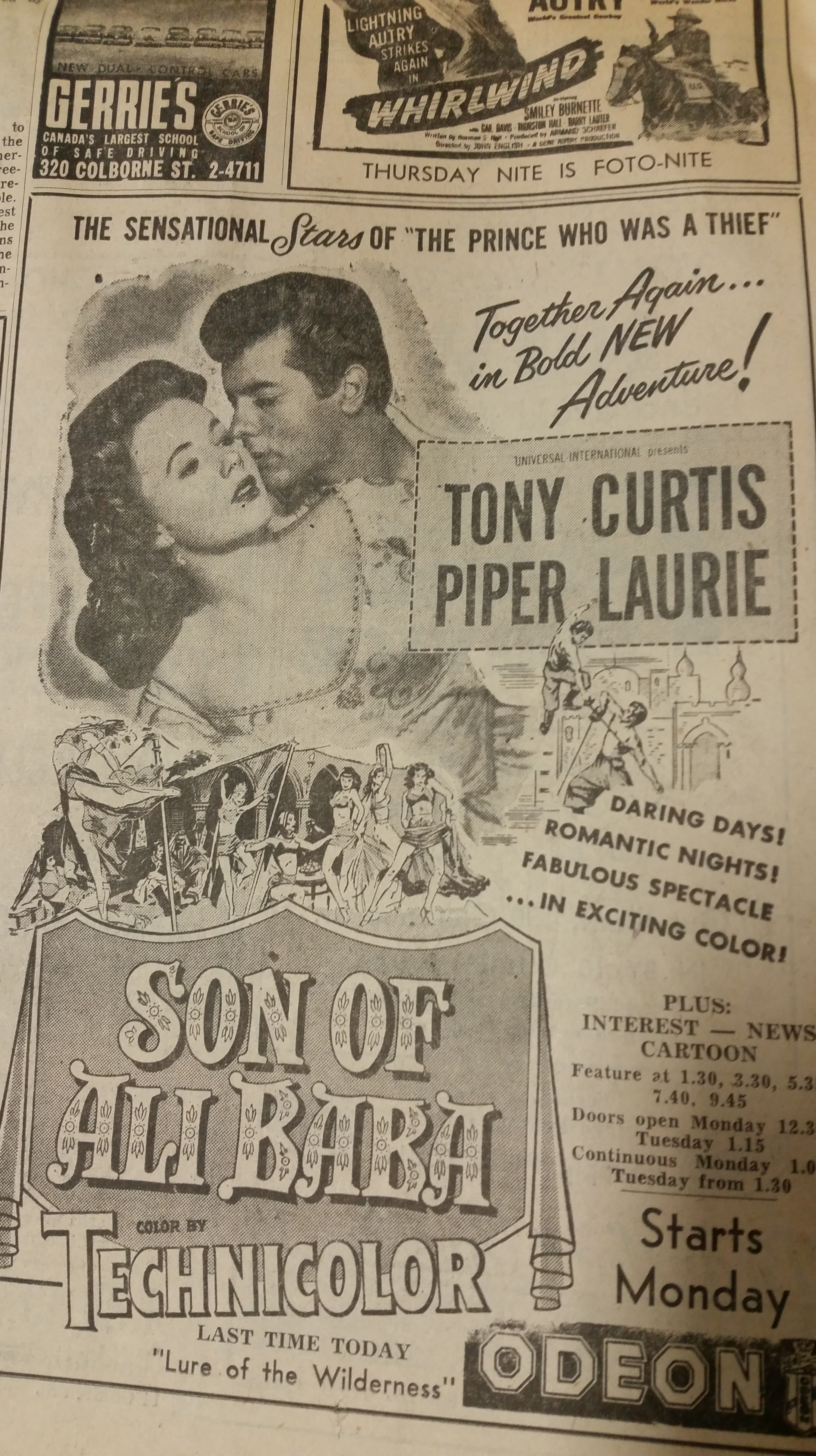 How about getting your favorite girl and heading out to see the latest adventure from Universal International starring their young stars in the making, Tony Curtis and Piper Laurie?