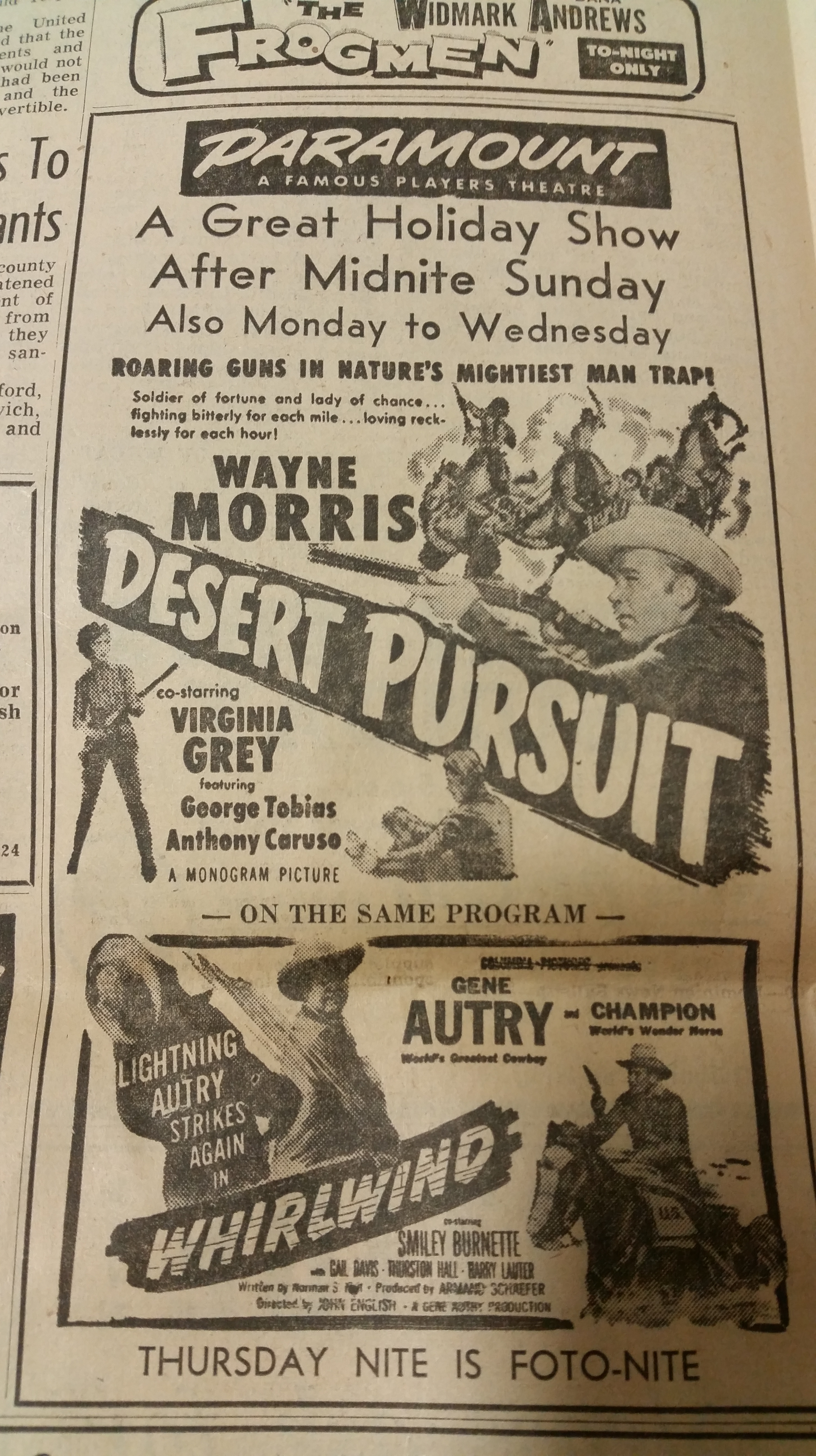 Looking for adventure? Then check out the latest Gene Autry western or maybe Wayne Morris with leading lady Virginia Grey and a couple of well known character players, Anthony Caruso and George Tobias. Notice that Thursday night is Foto-Nite.