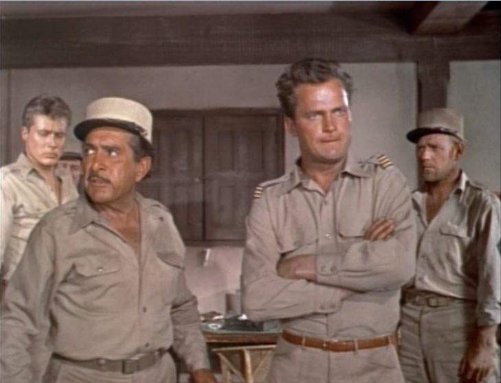 This is a bit of an Alamo styled tale when the on duty troops at the desert Fort are awaiting their relief column which is to be commanded by the tough American member of the Legion, Meeker. Ralph arrives by helicopter and renews his friendship with the gruff Sergeant at the Fort played by the wonderful J. Carrol Naish. It’s beginning to look as if the troop that is marching in are missing in action. It won’t be long before Meeker and his new command find the replacements slaughtered. There’ll be no relief for the men on duty that aside from Naish includes a young John Smith.