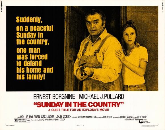 This Canadian made production plays out it’s story on the fateful Sunday of the film’s title. It’s a serene countryside location near Bolton, Ontario with some folksy music played over the opening credits. We’re getting the gentle side of Ernest Borgnine as a widowed farmer who has a granddaughter to raise played by Hollis McLaren. It’s Sunday and that means church. Setting the tone for what is to come, the radio reports that three men are armed and dangerous in the area after robbing a bank and killing some innocent bystanders.