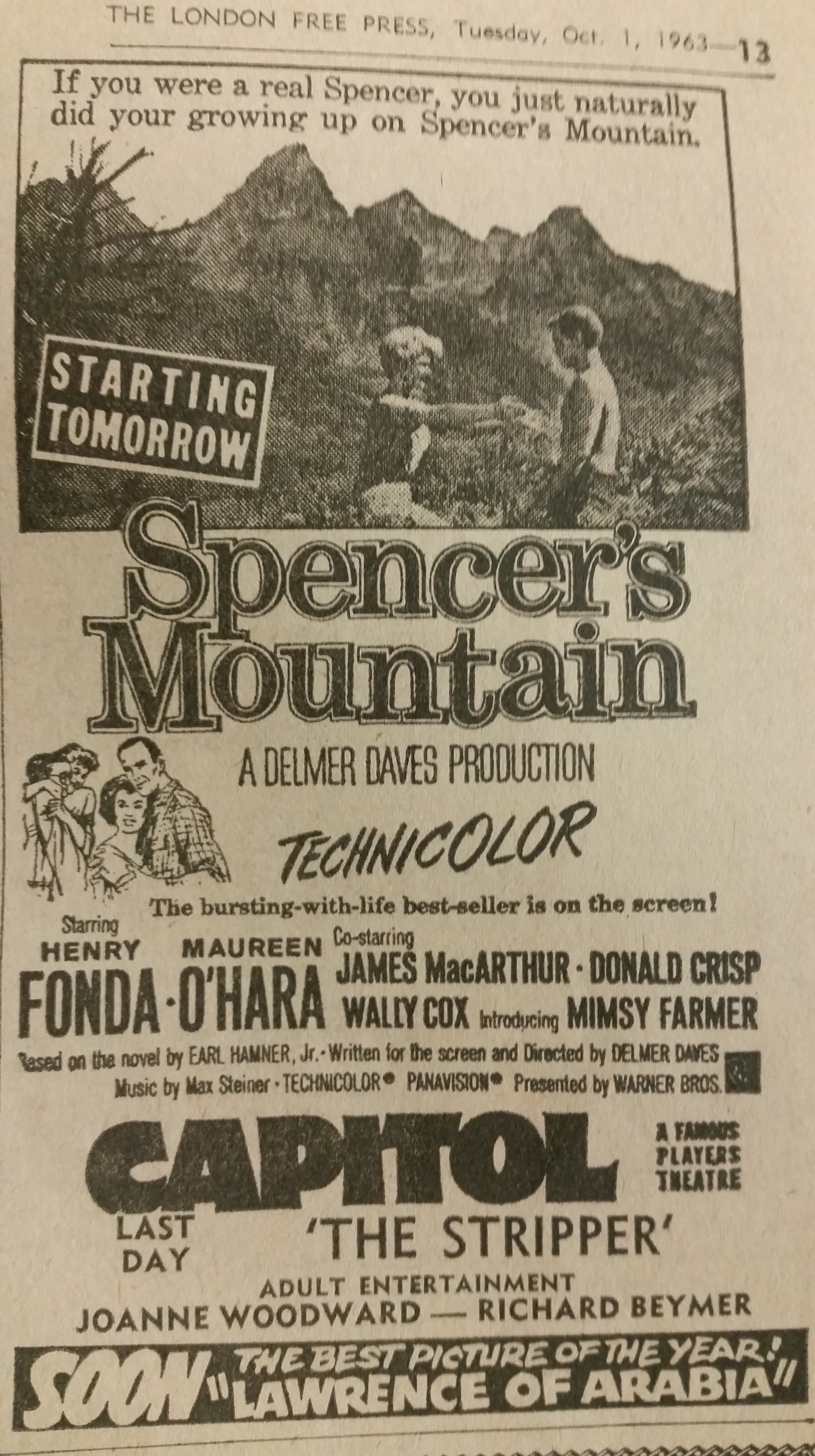 Take the whole family in to see Spencer’s Mountain and leave Dad behind to maybe catch the last night showing of Joanne Woodward as The Stripper.