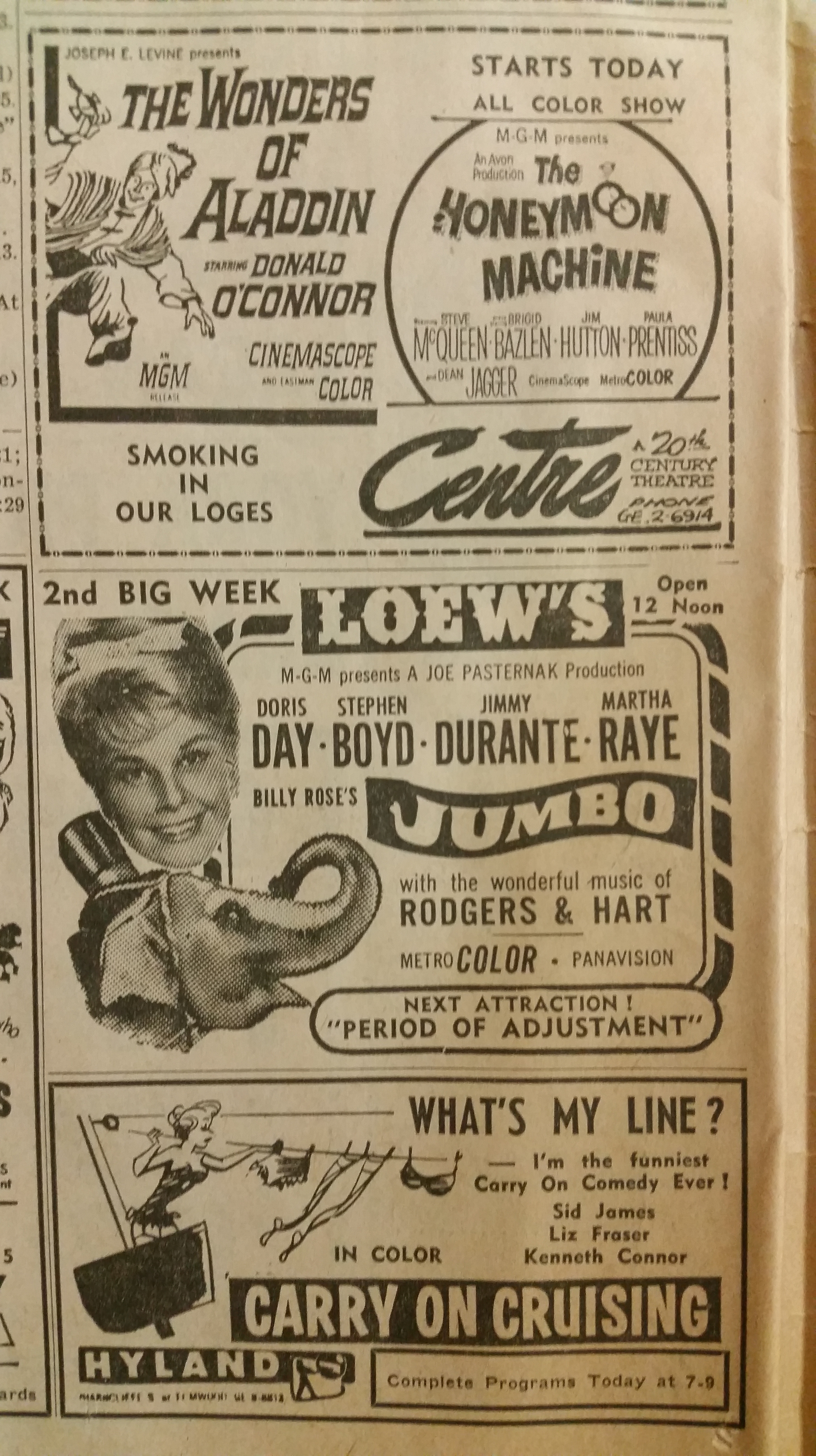 What to choose? Donald O’Connor? How about that new guy Steve McQueen? Doris Day always entertains. I’ve heard about those Carry On shenanigans from over in England……… nudge, nudge, wink, wink.