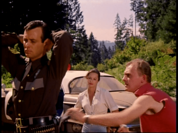 Fast talking Janssen delays what seems to be the inevitable and leaving his partner handcuffed to a tree, he agrees to get the trio safely out of the area. It isn’t long before his Captain back at the police station suspects something has gone awry with Janssen a no show after calling in his capture. Utilizing the picturesque backdrop of location filming, in order to avoid road blocks, Janssen takes the trio into the woods on foot. Could he be a Rambo style of backwoodsman? Kind of as he’s more than familiar with the area while Gorshin and company are just plain”city folk.”