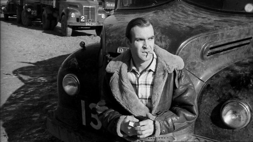 Let the hazing begin when Baker meets his fellow company drivers who must make a minimum of twelve runs daily to hold their jobs which only promotes the most reckless driving one is likely to see on any country road. A list of well known faces populate the driving force which include a pre fame Sean Connery, Sidney James, Gordon Jackson, Herbert Lom in one of his most likable roles and starring as the company’s top dog and all around son of a bitch, Patrick McGoohan. McGoohan takes an instant disliking to the quiet reserved Baker who he can somehow sense might be the one man to challenge his authority around the gravel yard.
