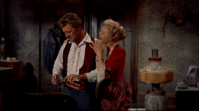It’s also here in Dodge that Ted de Corsia will ride in fronting a gang of rowdies including Ireland that sees Kirk and Burt standing tall in the face of death. Needing a leading lady for Burt the film casts gorgeous Rhonda Fleming in Edith Head gowns as his romantic interest that at first starts them out on two opposing sides of the law. She’s a gambler and Burt won’t have a woman gambling in the saloons. It’s bound to cause trouble. Such is the cowboy way of life. Fleming is striking as always in color features and look no further than her role opposite Bing Crosby in A Connecticut Yankee in King Arthur’s Court for proof.