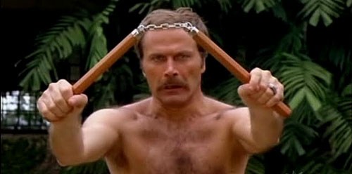 Keeping the camp quotient at a high is Christopher George taking on the role of the baddie. All he wants is to acquire the land owned by Susan. Apparently there’s oil under the ground that is worth a fortune. When the hoodlums he continually sends in return beaten all to hell, he decides he needs a ninja of his own to face off against this man with the lethal weapon hands. Time for the nasty Kosugi to reappear for a showdown with Nero.