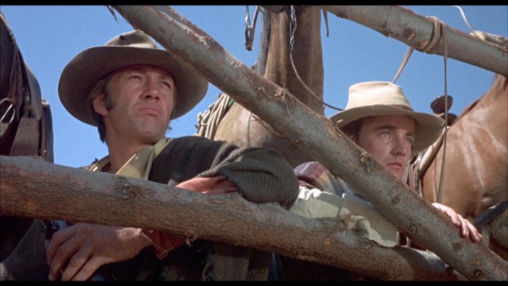Mitchum who’d been known to sing on occasion and had released recorded material warbles the title track over the opening credits here as a troop train of Mexican bandits headed by Rodolfo Acosta pulls into a sleepy south of the border town. As Acosta lines up some unfortunate souls for execution, rookie gunslingers Walker and David Carradine board the train and once it gets under way, crash into the caboose car and execute Acosta and his chief officers. They then promptly steal a couple horses and make their way back to the border. Only Carradine makes it, deserting Walker who has his horse shot out from under him.
