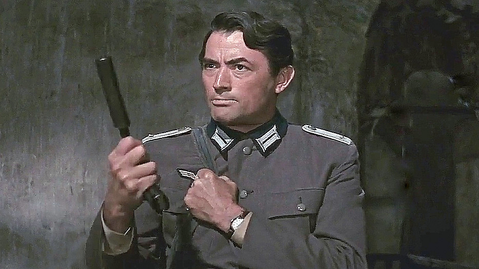 Gregory Peck as Mallory ….. ” Well, son… your by standing days are over! You’re in it now, up to your neck! They told me that you’re a genius with explosives. Start proving it! You got me in the mood to use this thing, and by God, if you don’t think of something, I’ll use it on you! I mean it. “