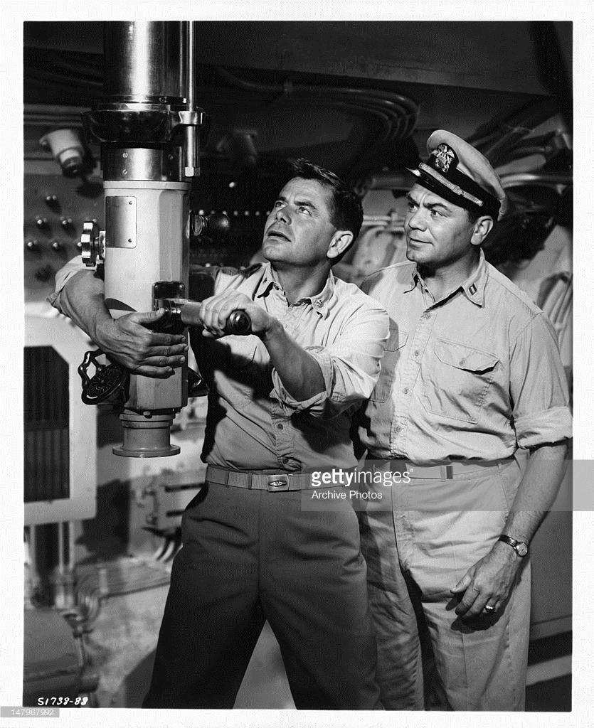 Orders come down that Glenn and Ernie are to attack a Japanese aircraft carrier that is the most sought after target by the U.S. Navy. It’s heavily guarded with destroyers and using a civilian filled ship to run interference and one that’s meant to take any incoming torpedoes. You bet. Glenn’s family is confirmed to be aboard that same ship. Glenn’s got a job to do and Ernie’s firmly against firing any of the “fish” at this time. And so here’s the “hook” in the Richard Sale script used as a melodramatic plot device. Sure seems a stretch to me but injecting items like these are meant to keep us on the edge of our seats I suppose. Silly as it is, the boys make it work and never once wink at the camera.