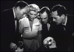 This reminded me of the dinner party game, How to Host a Murder. Tried one years ago and who knows, maybe this movie inspired the game makers to do something similar. All the guests including Atwill, Jerome Cowan, Veda Ann Borg, Jacqueline deWit and John Whitmey will receive a package with a gift in it. A skull, a key, a chisel etc. will have something to do with Zucco’s plot to uncover who killed his wife and had him sent to prison. He’s prepped the spooky house with hidden passage ways and levers that will flood rooms in the catacombs beneath the building.