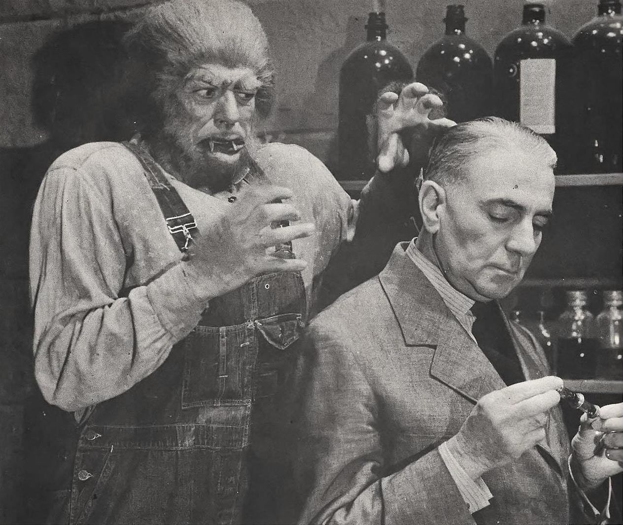 “I like pretty things.” says Strange in his Lennie like state when chatting up Zucco’s daughter, Anne Nagel. Anne of course has no idea of her father’s crazed experiments but thankfully the script will give her a boyfriend played by Johnny Downs who just happens to be an inquisitive reporter. Another plot device regularly utilized in these poverty row features. Before taking on the make up of the Frankenstein Monster, Glenn Strange would undergo a very Chaney like transformation here into a poor man’s version of a werewolf. In suspenders no less! Using a similar technique as Lon, Glenn will slowly change into his new look right before our eyes as Zucco unleashes him on those who he believes have wronged him.