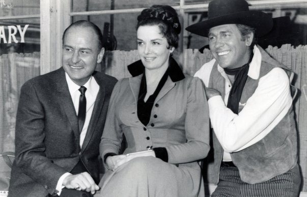 The customary shootout on main street is soon to follow with no surprises at the climax. As this is a Lyles production, you pretty much get what’s expected going in. Aging film stars, a worn out script and a western that seems outdated by the time of it’s release what with the arrival of the Italians and major stars like Lancaster, Wayne and Mitchum still actively making big scale productions. Having said that, there is a certain amount of charm in these Lyle offerings that gave stars well past their best before dates leading roles in a series of westerns he produced. They could easily been promoted as TV Movies of the Week if they’d been made in the 70’s. Leading players like Jane Russell and Howard Keel seen here with the producer.