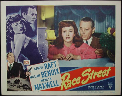 It’s George Raft once again taking on the role of the “good” gangland character. He’s a bookie with beat detective William Bendix for a pal and Harry Morgan as another bookie. Morgan’s had a bad leg since childhood (polio?) and Raft’s been his protector ever since. Lastly, Raft has a beautiful “dish” on his arm played by Marilyn Maxwell. Just as Raft is thinking of leaving his chosen racket and going straight and settling down with Marilyn, a new gang has moved into the San Francisco area selling “protection” and they’ve targeted the bookies around town as easy marks.