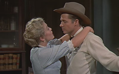 This includes character favorite Wallace Ford whose caught red handed by wife Wickes who promptly stages a donnybrook with Blanchard to the amusement of all the saloon regulars. Yes, Audie will have his hands full with Blanchard as the temptress with the temper to match and then the sweet farm girl he’ll come to know played by contract player Lori Nelson.