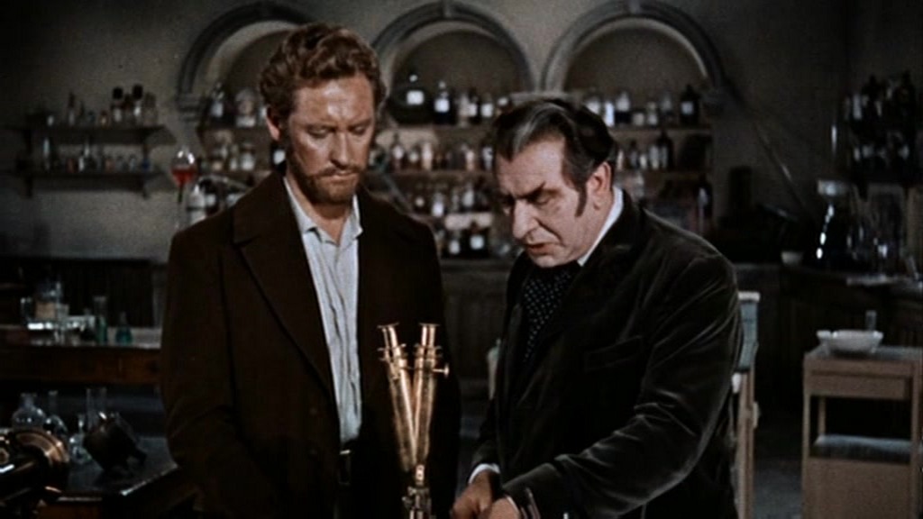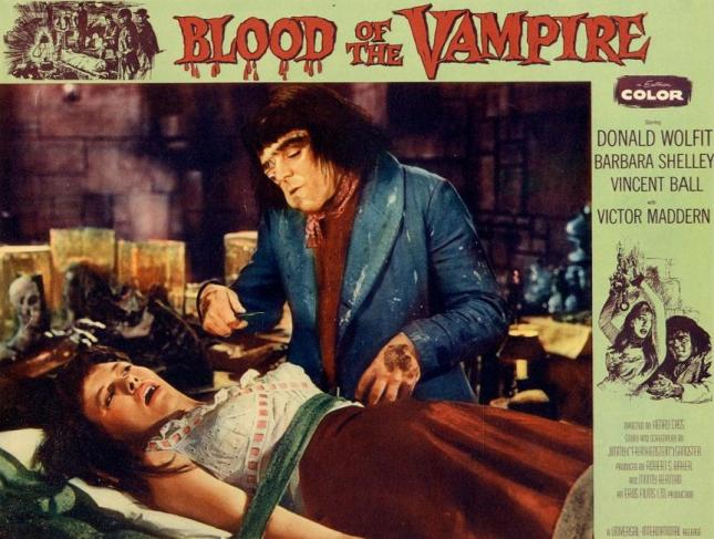 Writer Sangster had both this and Hammer’s glorious Dracula to his name in the same release year giving him two tales of vampires to place on his resume card. This one is no Dracula but more of an updated 1950’s color variation on the mad scientist flicks that Lugosi made for Monogram studios. It’s not a stretch to see Bela assuming the role enacted by Wolfit.