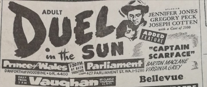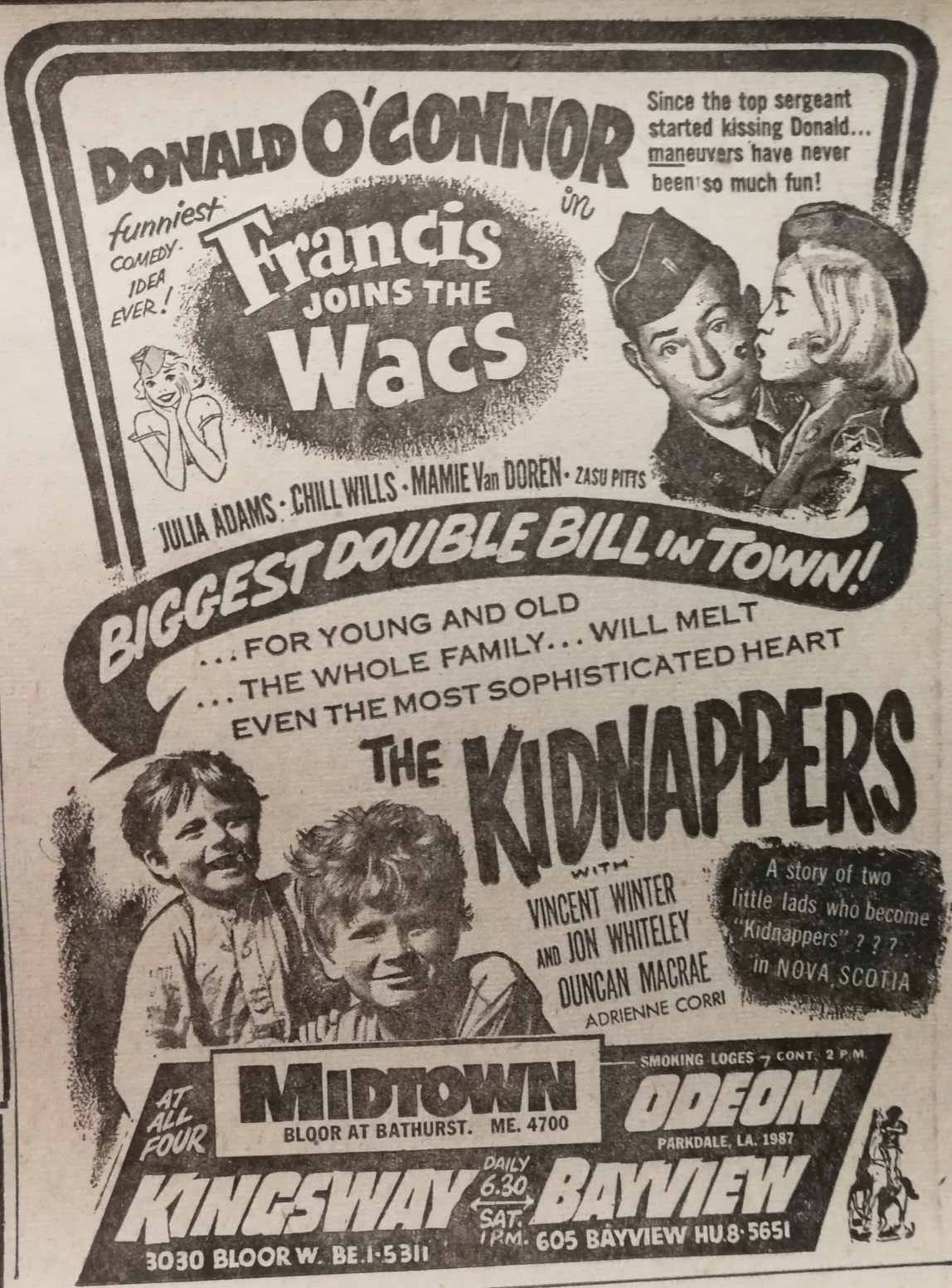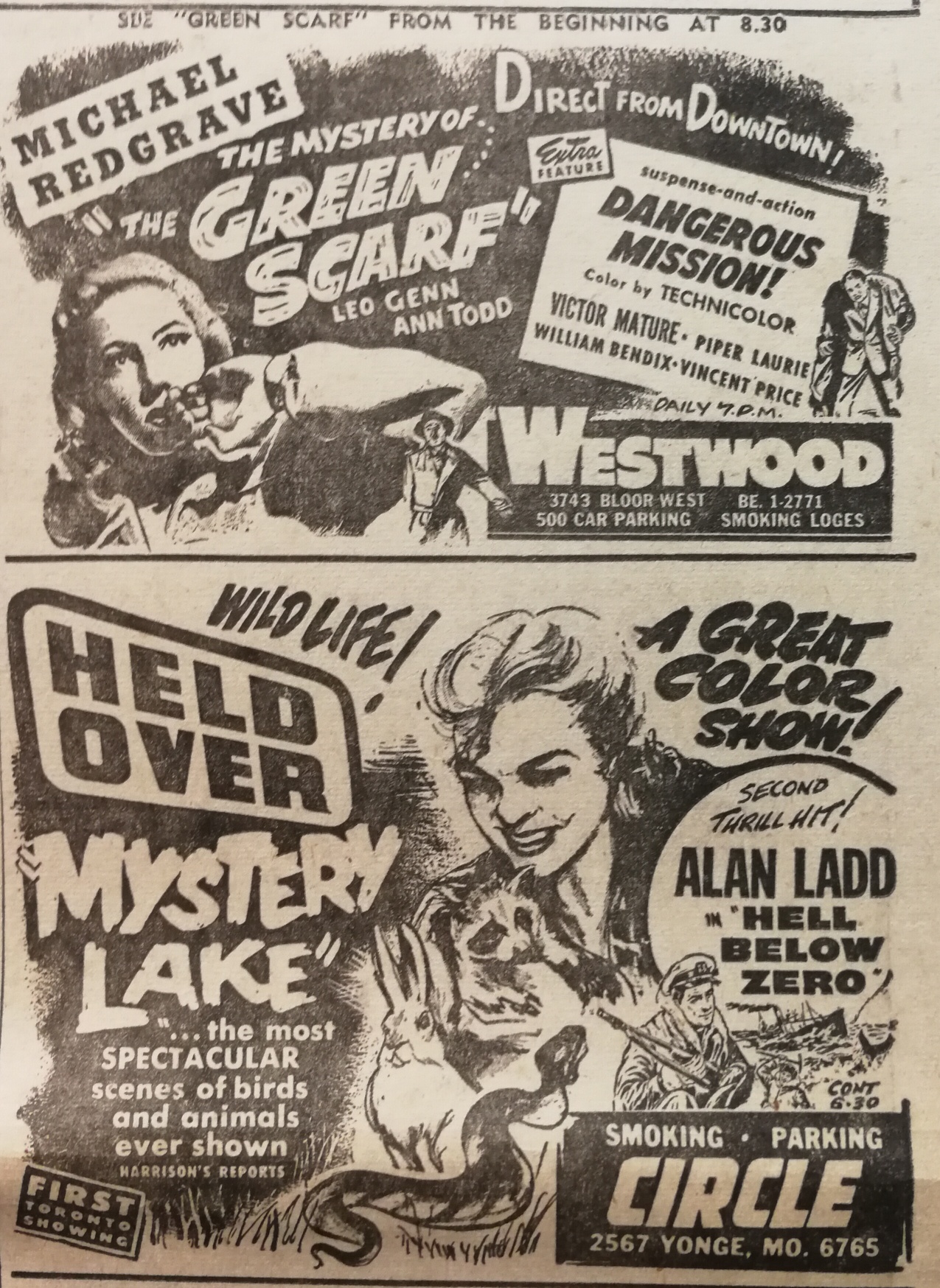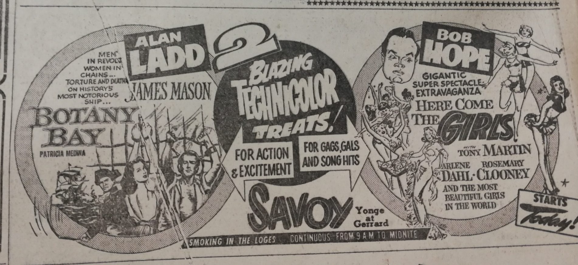 Alan Ladd films are playing all over town and Bob Hope even turns up for some fun and laughter at the Savoy on Yonge.