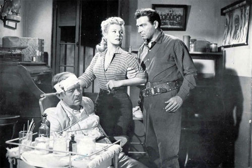 Unlike Devil’s Canyon, Miss Mayo’s screen time is mostly limited to the first thirty minutes in this tough western entry. Ryan and Hunter will continue to circle each other for the majority of the proceedings despite Ryan doing his best to teach the youngster how to stay alive and best manage a town when you wear a badge. The more pressure Ryan applies to Middleton’s operation, the more Middleton strikes back. This includes bringing in gunslinger Rodolfo Acosta to take out Ryan. Their violent encounter that will see Acosta shot down on the street will only serve to strain the relationship between Hunter and Ryan.