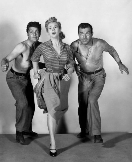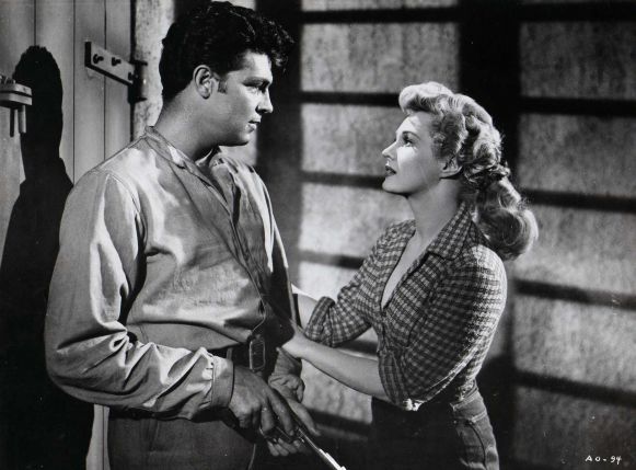 In this 3-D effort, Virginia scores top billing co-starring with two lesser known leading men and not quite the box office draws of those ahead in this Mayo spotlight, Stephen McNally and Dale Robertson. It’s an RKO release from the stable of Howard Hughes that takes place in Arizona Territory of 1897. Mayo looks splendid in her cowgirl get up as the film opens. Tight fitting jeans and shirt, lipstick painted on perfectly and the color photography illuminating her beauty for the paying public. Riding into a frontier town she’s on a mission to pay back a debt by warning Robertson that two gunslingers are gunning for him.