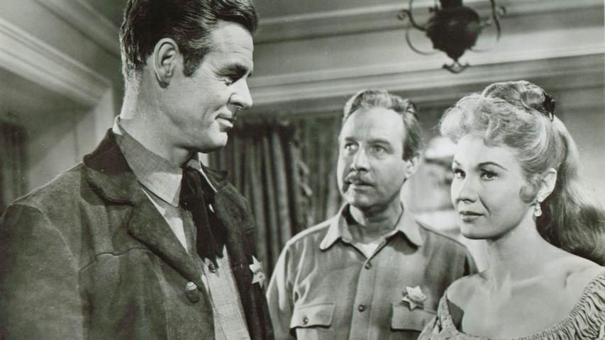 Once in town we’ll meet another first rate cast along with Ryan and Hunter. Miss Mayo runs the local restaurant and hotel in between taking time to look after her man and accepting his marriage proposal. Arthur O’Connell and Walter Brennan are Ryan’s deputies. Whit Bissell (again) is on town council, Edward Platt the town doctor, Richard Deacon a store keeper and bringing his villainous A game to the proceedings as a crooked saloon/casino owner, Robert Middleton. Middleton has long been a formidable foe on screen and one you’re not likely to forget.