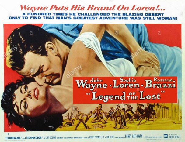 Between The Searchers in 1956 and Rio Bravo in 1959, John Wayne made a handful of films that I’m fairly certain most of us Duke fans would agree are not exactly his most memorable. Sadly his union with the latest bombshell to saunter across movie screens falls into that category. Duke was teamed with Sophia Loren for this Batjac (Duke’s company) desert treasure hunt production that looks beautiful thanks to Loren of course but alsoΒ  director Henry Hathaway and the famed director of photography, Jack Cardiff. Alas instead of treasure hunting they should have gone looking for a better script. Or if I might suggest they should have brought in Dick Foran to hunt down the tomb of the Princess Ananka.