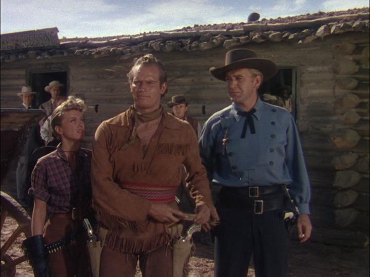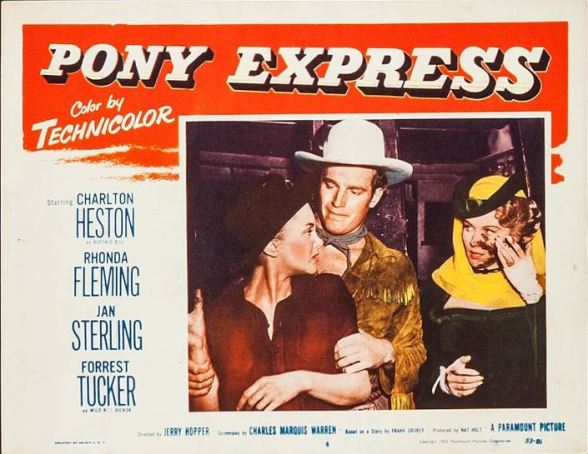 Both Jan Sterling and Rhonda Fleming inject some fun and humor into the film that features a surprisingly game Heston. I think Chuck is too often thought of as a straight laced, very rigid character. He does quite well here as Cody and adds a touch of humor when required. Both Jan and Rhonda continued to star opposite some of the era’s biggest stars for the balance of the decade in various genres. As for Mr. Tucker, he’s fine as Hickok but is strictly playing it second fiddle to Heston’s Buffalo Bill. Even character player Porter Hall turns up as another noted man of the frontier, Jim Bridger. Long time western writer Charles Marquis Warren is the credited scriptwriter. Warren would also pen the Heston’s Arrowhead released in the same year as this take on the Pony Express.
