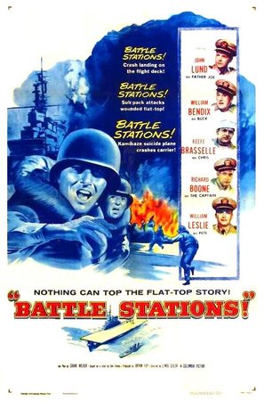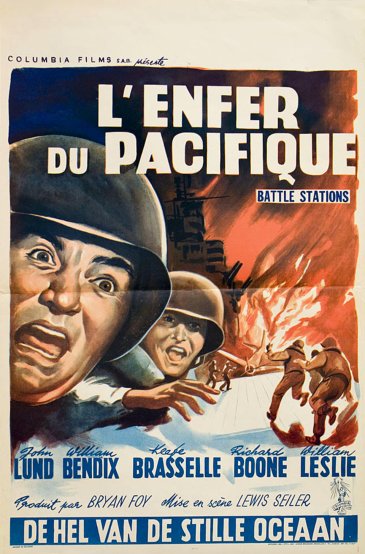 Battle Stations is a low budget affair produced by Bryan Foy of the Seven Little Foys vaudeville troupe. Just one year prior to this effort, little Jerry Mathers of Leave it to Beaver appeared as the producer in the bio pic The Seven Little Foys starring Bob Hope as Eddie Foy, the family’s patriarch. On Battle Station I suspect some real life officers were given dialogue during the filming aboard an active Navy vessel which lends the film some authenticity at times. Especially when Bendix is on deck barking orders at shell shocked extras. Credited as technical advisors are Captain Wm. A. Moffett U.S.N. andΒ Β Rear Admiral Joe Taylor U.S.N.{Ret.}. The fact that some of the movie is filmed on board a ship gives it a leg up on many of the other programmers that come and go in movie houses. Then again maybe I’ve been fooled with some early form of CGI.