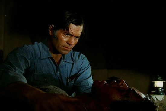 When the front blade of the bulldozer comes into contact with the giant rock half buried on the shoreline it releases a large energy that burns one of our workers to death and when Walker looks over the giant machine, it seems to take on a life of it’s own prompting him to disable it. After narrowly surviving the ordeal Walker will tow it in to camp where mechanic Neville Brand will see if he can get it up and running.