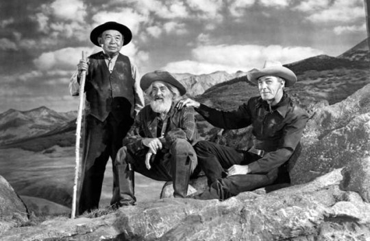 Injecting some added drama into the plot occurs when Williams, who would rather be panning for gold then running cattle, loses an arm in a stampede caused by Jory’s gang of ruffians and Jim Davis in particular. Davis being another long time western heavy. Scott and Foo will leave the brooding Williams in town minus their stolen herd when who should they meet? George “Gabby” Hayes who invokes just a touch of Walter Huston’s Oscar winning role as the old time prospector seeking the Treasure of the Sierra Madre. But then Gabby always seemed to be playing that old prospector so maybe I’ve got it half assed backwards.