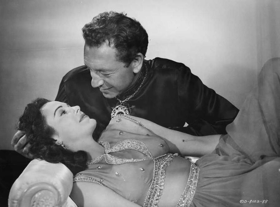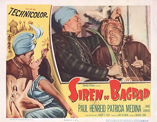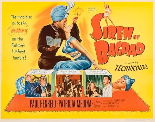 Filmed in technicolor under the guidance of director Richard Quine and producer Katzman, Henreid stars here as the jovial Kazah the Great. A magician who takes his pleasures as they come while entertaining sheiks and kings with feats of magic and a harem of dancing girls. For a sidekick he has Hans Conried as the film’s comic relief and all around idiot. It’s in a desert oasis that he and his troupe are raided by black robed bandits who steal the women and put them up for auction in the center square of Bagdad. In hot pursuit of the lovely ladies are Paul and Hans.