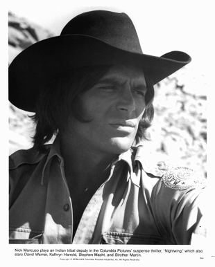 But tourism isn’t what this thriller is all about. It’s about the deadly vampire bat and how Nick Mancuso, Kathryn Harrold and David Warner are going to prevent the thousands of night feeders from spreading plague throughout the territory. Nick is portraying a Native American tribal ranger in the tradition of a Chief Brody called in to investigate the death of a rancher’s horse. It’s been bled dry and cut to ribbons as if tiny razors had slashed it over it’s entire body. It’s at this point we’re also to meet Stephen Macht. He’s taken our money is more important than safety political role on the reservation. He’s our Mayor Larry Vaughn of the script.