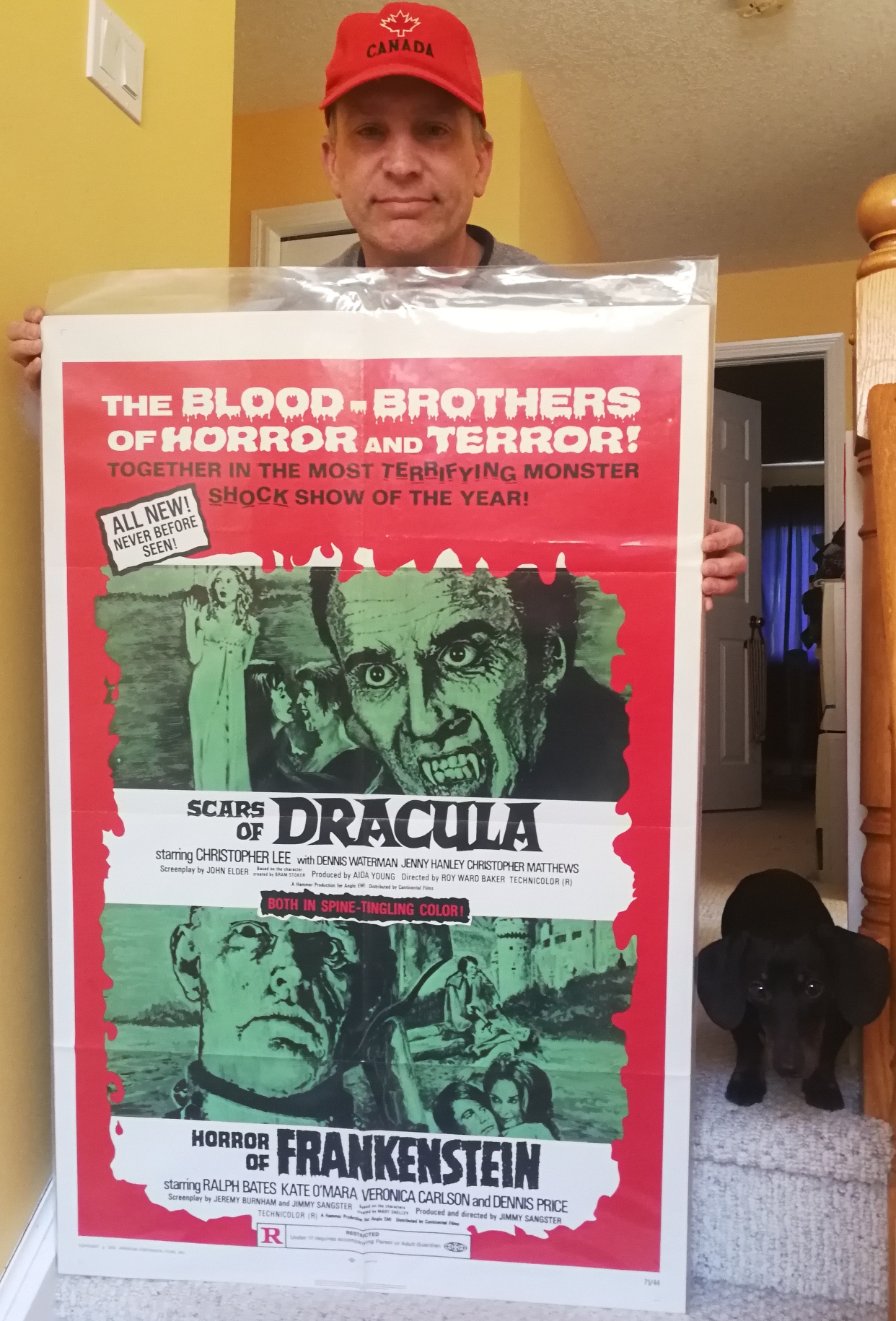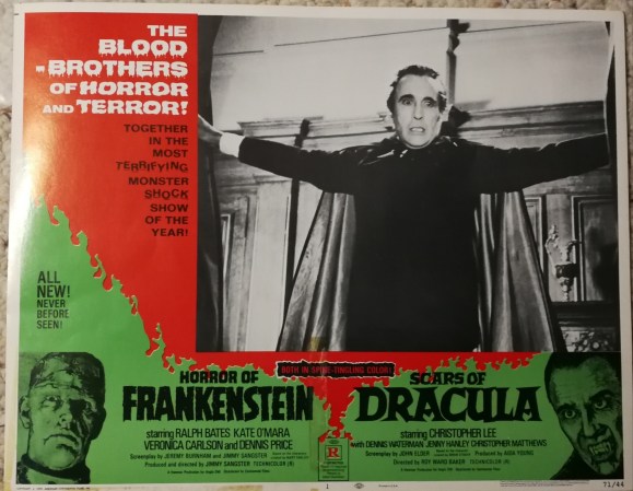 So here we are a couple hours from home and pass by Antiques on HWY 48 near the Barrie area of Ontario, Canada and what should I find just inside the entry way? This must have lobby card featuring Christopher Lee in 1971’s North American double bill release of Hammers’ Scars of Dracula and Horror of Frankenstein. As I mentioned earlier, I haven’t even begun to scratch the surface of the lobby cards I have tucked away and still the pile grows.