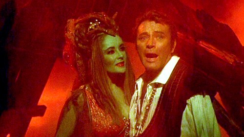 Besides Liz coming and going in Burton’s dream sequences, the seven deadly sins will surface as does borrowed footage of knights clashing on a battlefield. Just not sure what movie the stock footage is from. Many of these sequences that see Burton and Mephistophilis appearing in different settings are rather bizarre and again I’m not sure where we’re heading in many of them until Liz appears and Burton gets all weak in the knees.